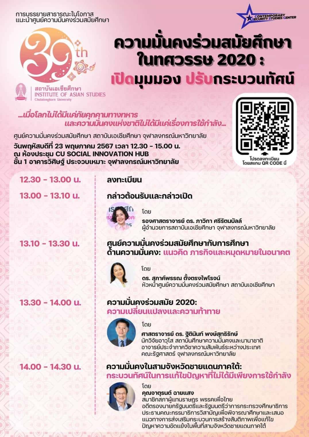 The Contemporary Security Studies Center (CSSC), Institute of Asian Studies, Chulalongkorn University organized this public academic forum to expand understanding of modern security issues at both global and local levels, with particular reference to Thailand’s southern border provinces. The event was free and open to all, promoting critical awareness of peace and security in society. [ https://www.chula.ac.th/news/159587/ ]