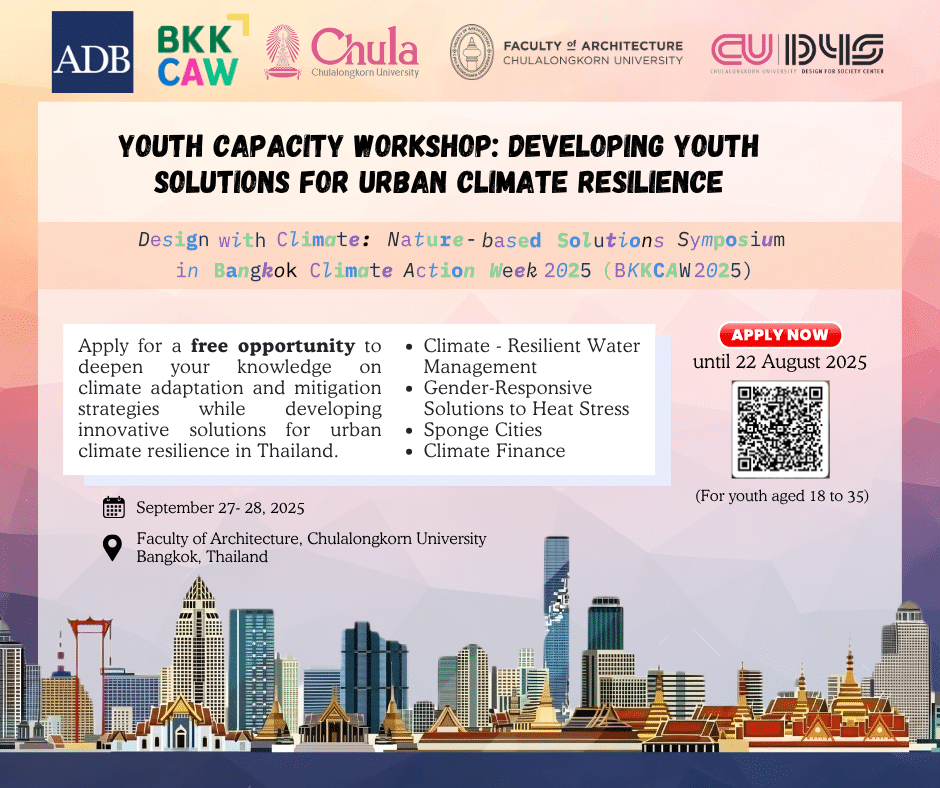 As a key component of the Nature-based Solutions Symposium, the Asian Development Bank (ADB) will lead an innovation workshop on “Youth Capacity Workshop: Developing Youth Solutions for Urban Climate Resilience” designed to empower young change-makers in urban climate resilience in Thailand. This dynamic two-day workshop will combine expert knowledge-sharing on a wide range of urban climate resilience topics, including sponge city, solutions for heat stress, water management, and climate finance, with a design thinking approach, enabling youth participants to design and pitch actionable projects tailored to specific urban issues in their cities.