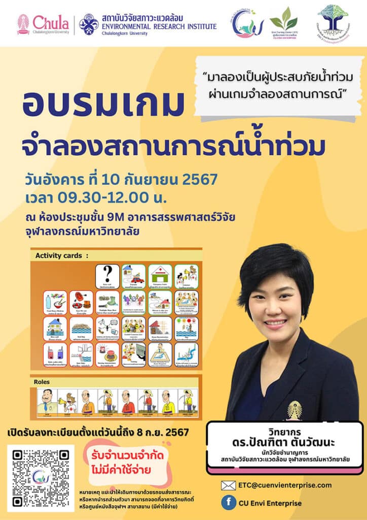 The Environmental Training Center (ETC), in collaboration with the Climate Risk and Resilience Research Cluster at Sustainable Environment Research Institute, Chulalongkorn University, will host a workshop titled “Gaming Simulation for Flood Risk Reduction” on September 10, 2024. The workshop is open to faculty members, students, staff, and the general public. It will be held in the 9M conference room of the Sabbasastravicaya Building at Chulalongkorn University, and participation is free of charge.