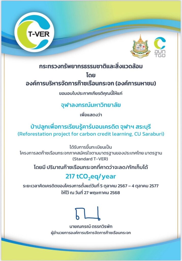 The project’s success is evidenced by its official registration under Thailand’s Voluntary Emission Reduction Program (Standard T-VER), certified by the Thailand Greenhouse Gas Management Organization (Public Organization), Ministry of Natural Resources and Environment, on May 27, 2025. The 42.2-rai area is capable of sequestering up to 217 tons of CO₂ equivalent per year, making it the highest carbon sequestration rate per unit area among higher education institutions in Thailand.
