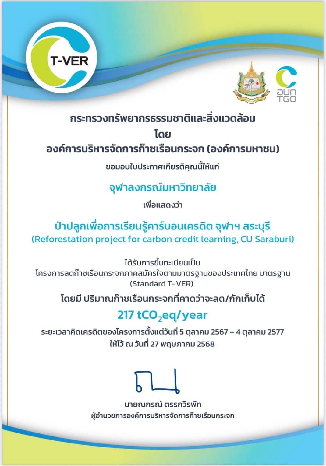 The Reforestation Project for Carbon Credit Learning, CU Saraburi, is implemented by the Center of Learning Network for the Region (CLNR), Chulalongkorn University, with strong collaboration from university administrators, faculty members, staff, students, alumni, as well as local communities and the private sector. Together, they have transformed a 42.2-rai (approximately 16.6-acre) area of Chulalongkorn-owned land in Tan Diao Subdistrict, Kaeng Khoi District, Saraburi Province, into a lush green space that serves as a living classroom for ecological learning.