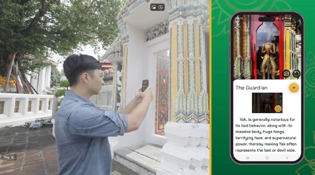 This application transforms Wat Pho into an engaging and enjoyable learning destination by integrating augmented reality (AR) and virtual reality (VR) technologies to present Wat Pho’s fascinating contents, which are exceptionally complicated—rooted in deep and subtle beliefs. This includes, for example, the explanations of spatial planning principles, architectural components, artistic details, historical stories, and also the decodes of the riddle poems inscribed on the Epigraphic Archives of Wat Pho which UNESCO registered as the Memory of the World. The application also initiates interactive, site-based activities in the form of games, such as searching for historical viewpoints through old photographs or finding the real “giant guardians of Wat Pho.” These activities enhance both the enjoyment and the learning experience, leaving visitors with lasting impressions and a greater appreciation of Wat Pho’s heritage.